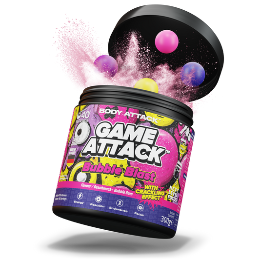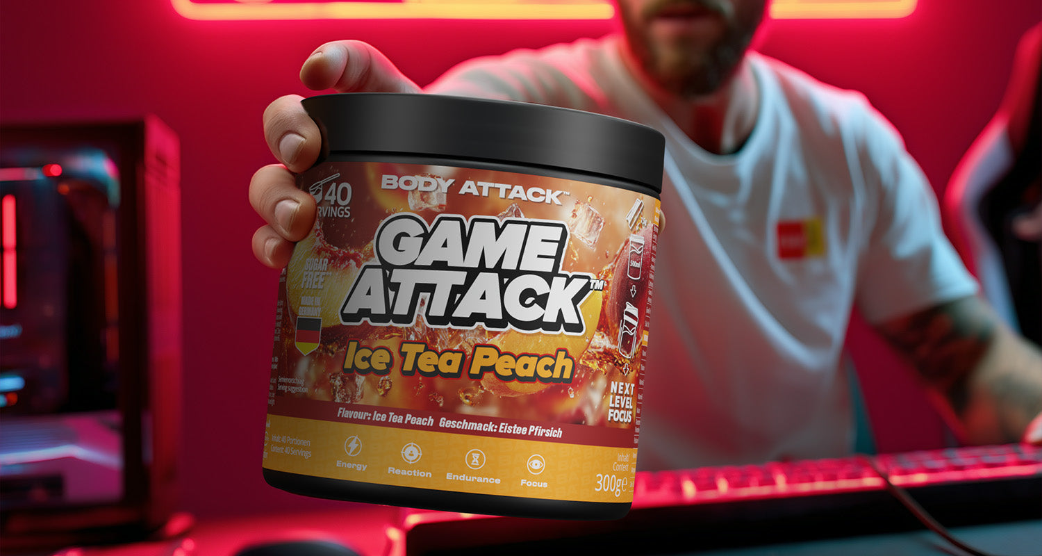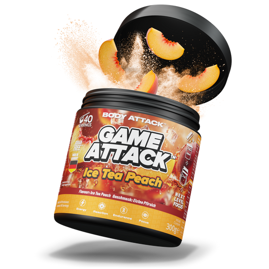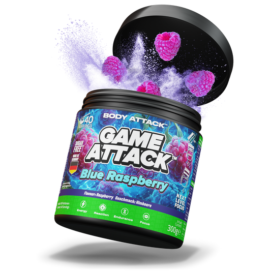 GAME ATTACK ist Performance zum Trinken: 18 gezielte Inhaltsstoffe plus 3 Power-Wirkstoffe für Fokus, Reaktion und langanhaltende Energie. Entwickelt mit dem Know-how von Body Attack, geprüft in Deutschland und geschmacklich on point. Du bekommst 40 Portionen pro Dose bei nur 17 kcal – transparent, effizient und fair kalkuliert (ab 0,87 € pro Serving). Ideal fürs Ranked Match, fürs Lernen, fürs Training. Keine Kompromisse, kein Koffein-Crash—nur saubere Power, wenn’s zählt.